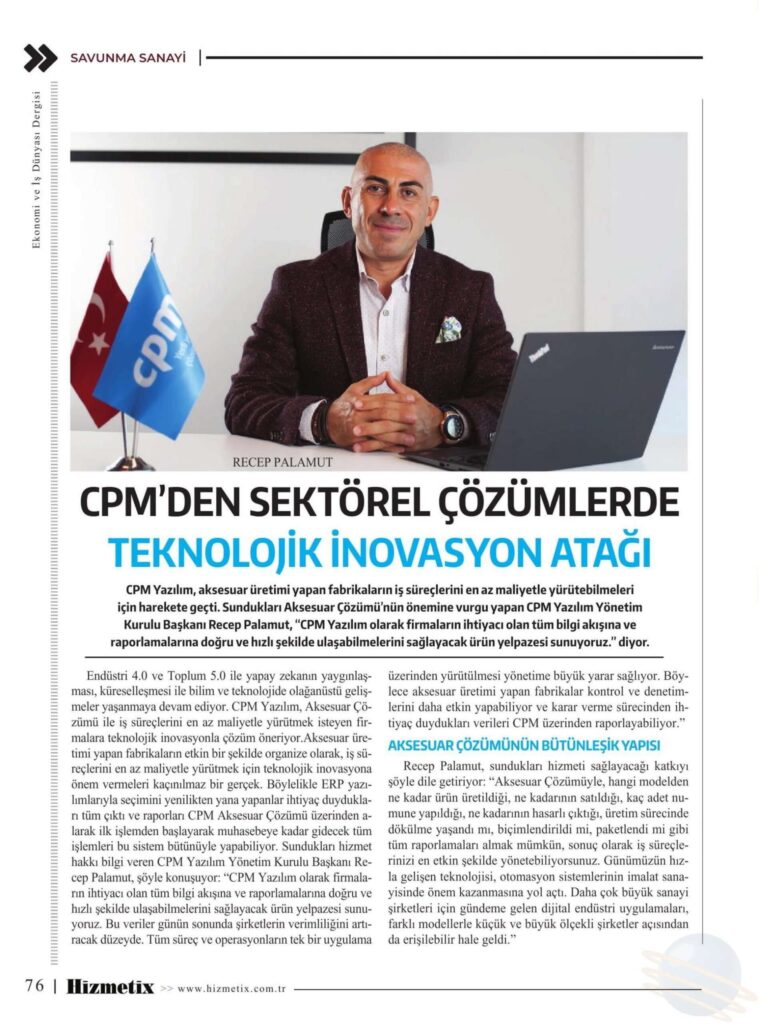 Cpm Yazılım, Aksesuar üretimi yapan fabrikaların iş süreçlerini en az maliyetle yürütüyor. Sundukları Aksesuar Çözümü’nün önemine vurgu yapan Cpm Yazılım Yönetim Kurulu Başkanı Recep Palamut, ”Cpm Yazılım olarak firmaların ihtiyacı olan tüm bilgi akışına ve raporlamalarına doğru ve hızlı şekilde ulaşabilmelerini sağlayacak ürün yelpazesi sunuyoruz.” diyor.